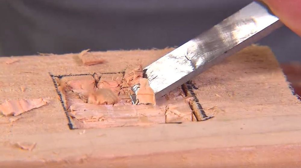 Teken eerst af en zet de beitel zo in dat je een vierkant afbakent. Het hout dat je wil wegwerken, kan je nu wegwerken met de beitel. Zet de beitel op de hoek.